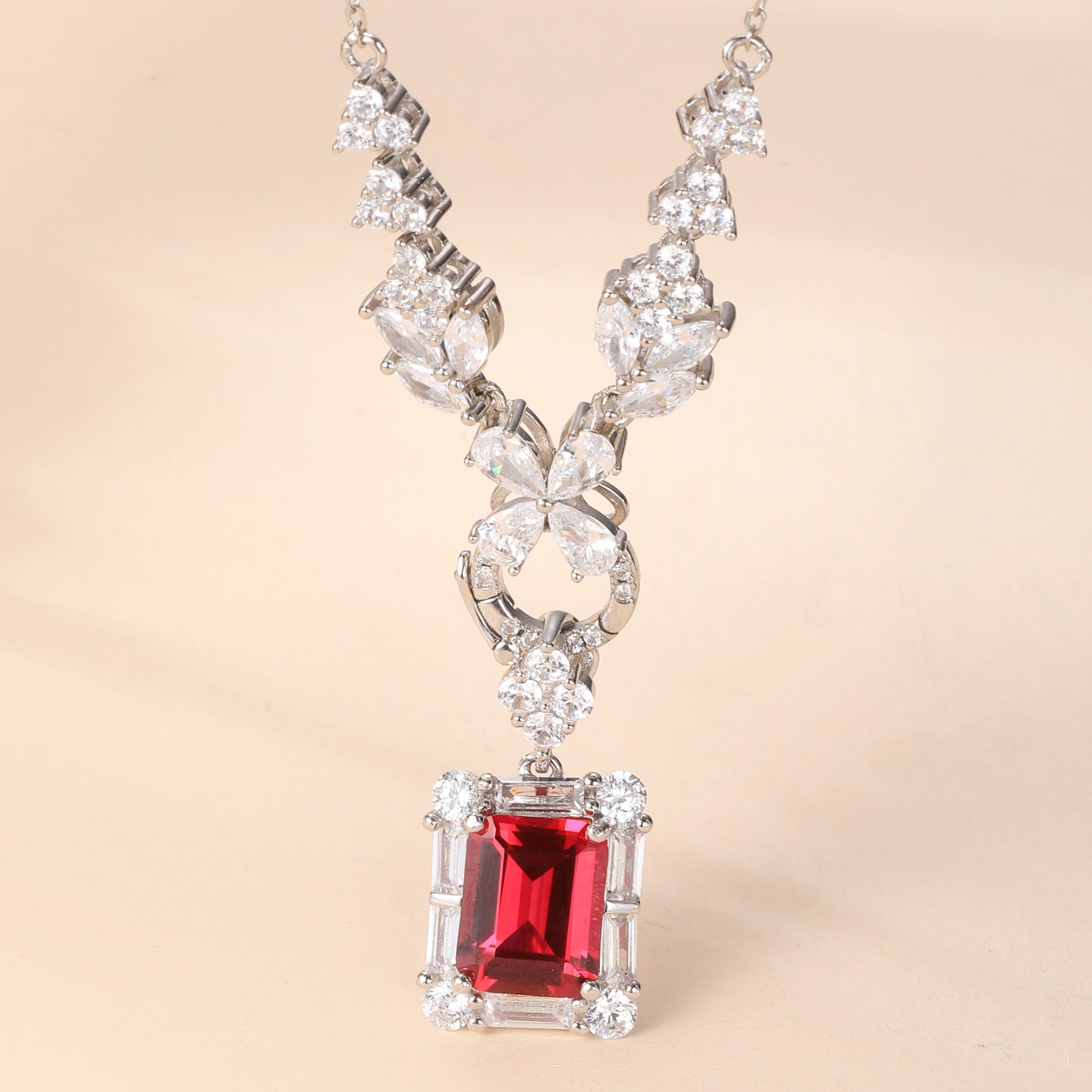 Sterling Silver Ruby - Red Cubic Zirconia Floral Statement Pendant Necklace